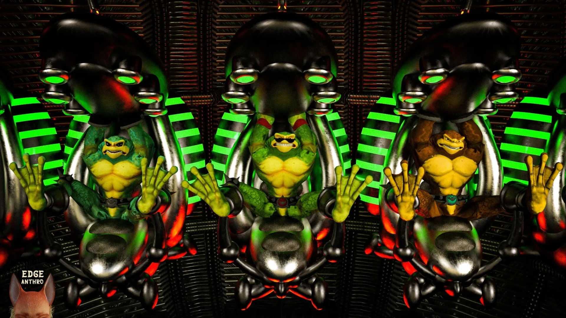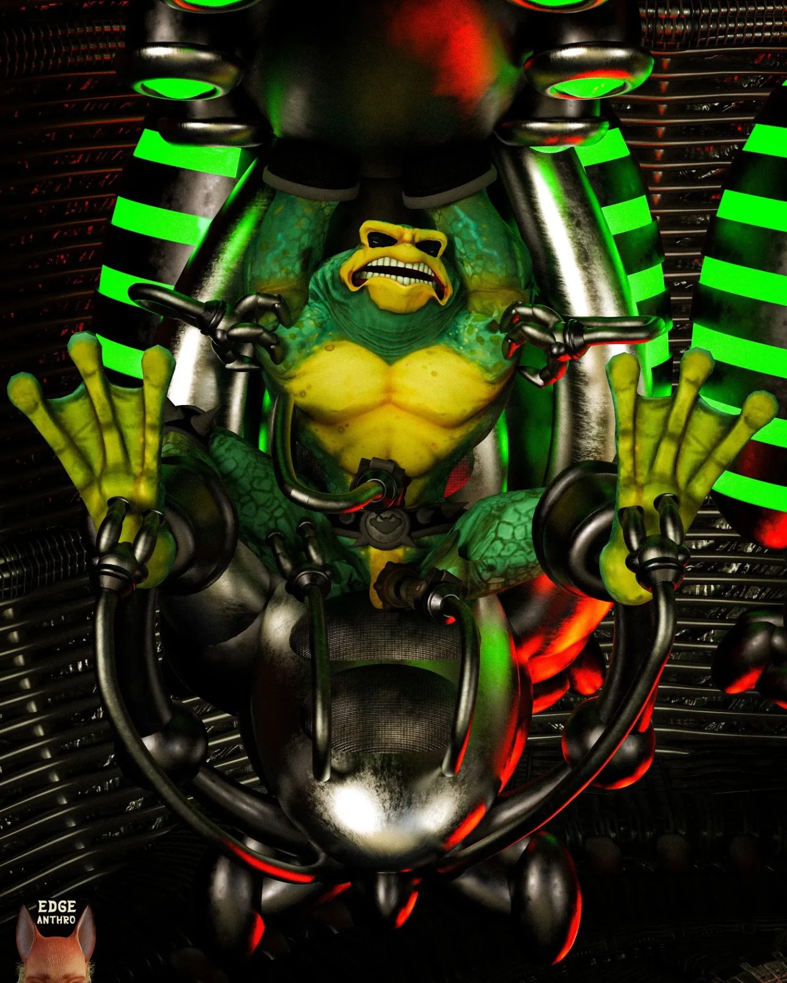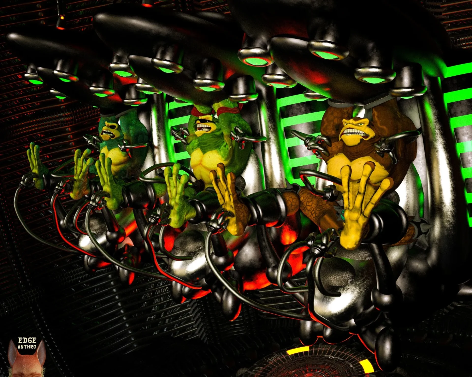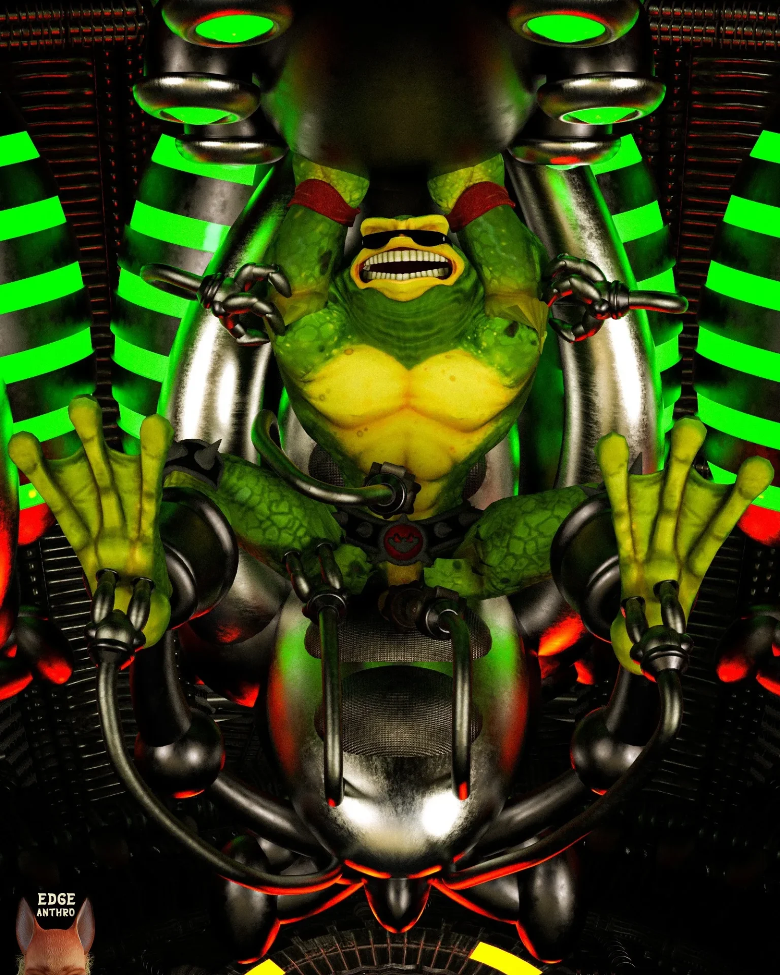Rash, Zitz, and Pimple find themselves bound to a massive machine deep in an alien spacecraft. No amount of squirming can break them free. Metal hands coil toward them, tickling their armpits and feed. Tentacles pound their abs and balls. Finally, the milking begins, with tubes latched firmly on each of their members, draining every drop possible, only to force feed it back into each Battletoad. It makes it clear this milking is meant to last for a long, long, looong time.