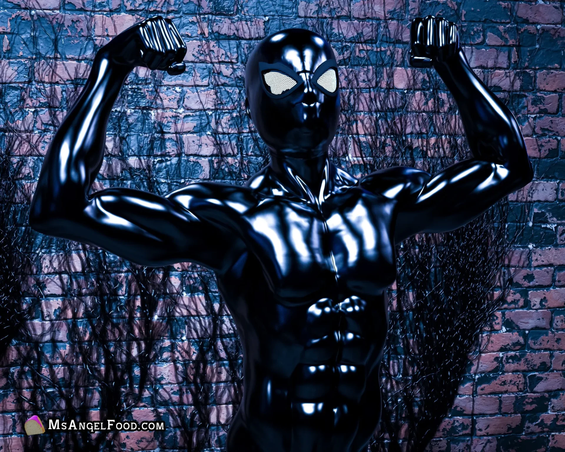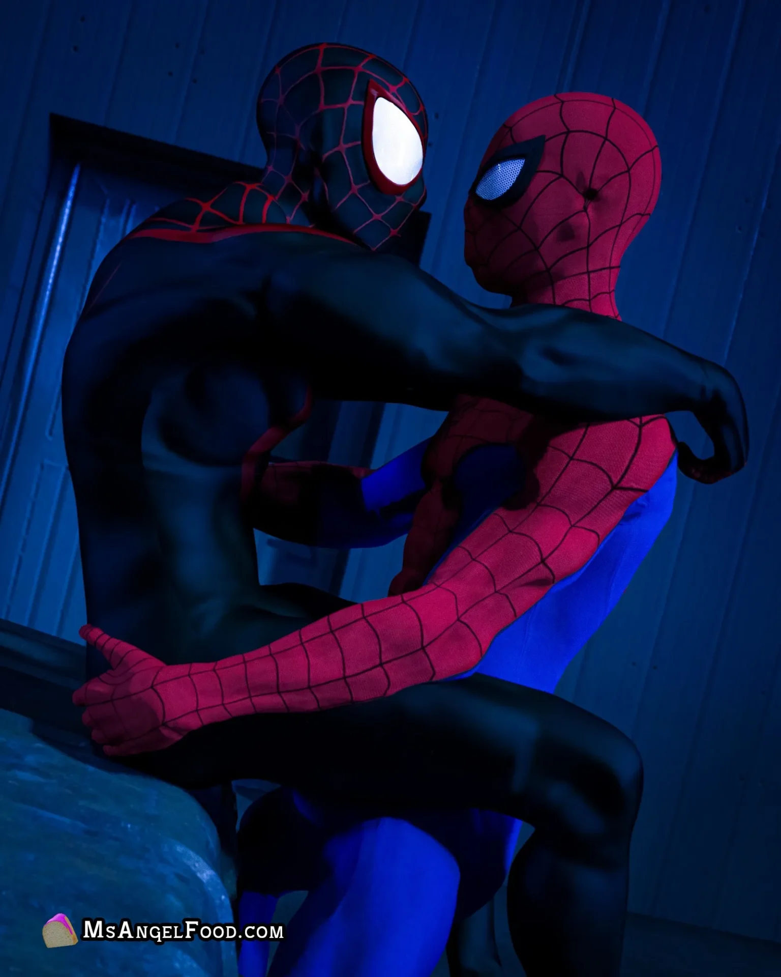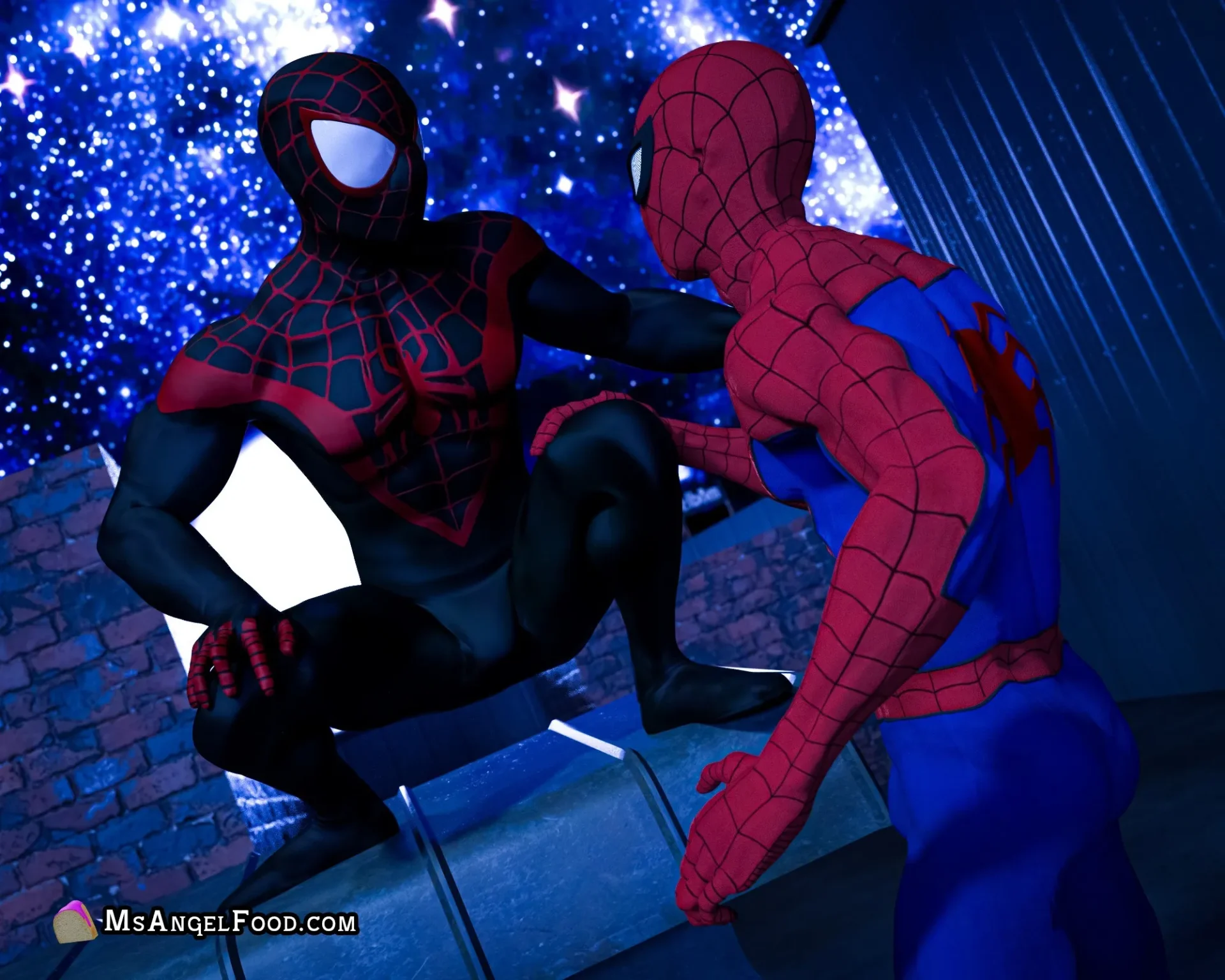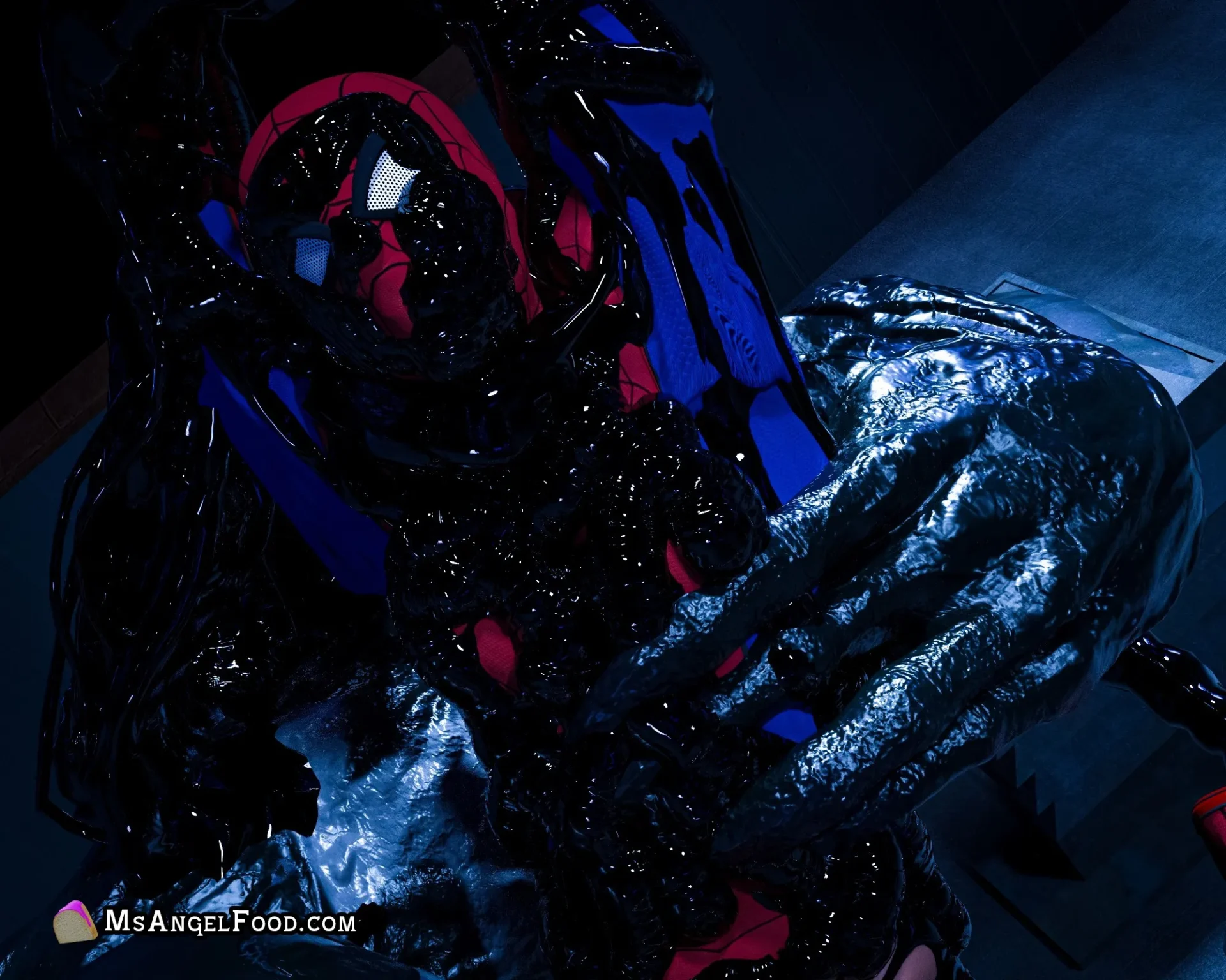 Peter and Miles take a break from patrolling for some late-night unwinding. But as they get close, a cold, slimy hand catches them from behind. Venom grabs Spider-Man, slowly covering him in black, symbiotic goo, draining him at the same time. Venom takes advantage of both his captive Spiders, sucking them, penetrating them, and overall dominating them. Both Spider-Men get webbed to the wall, watching their bellies grow, transforming both into newly captured symbiotes, fully under Venom’s control. And with new, giant muscles to match.