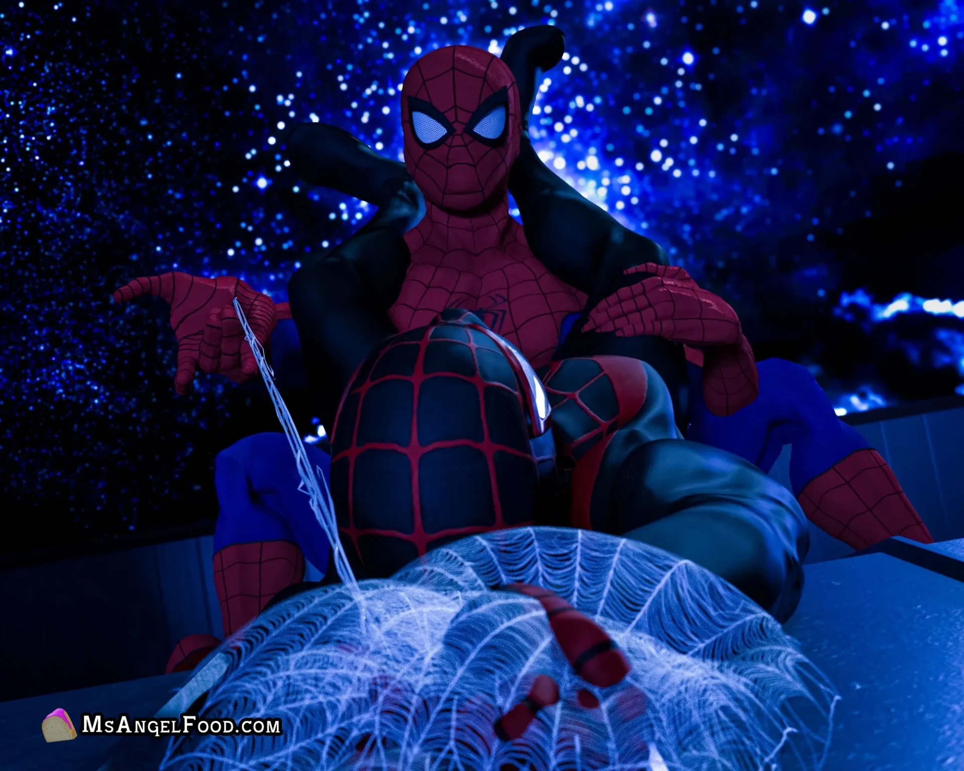 Enjoy 66 widescreen images featuring a five-way Spider-Man orgy covered in sticky webs.